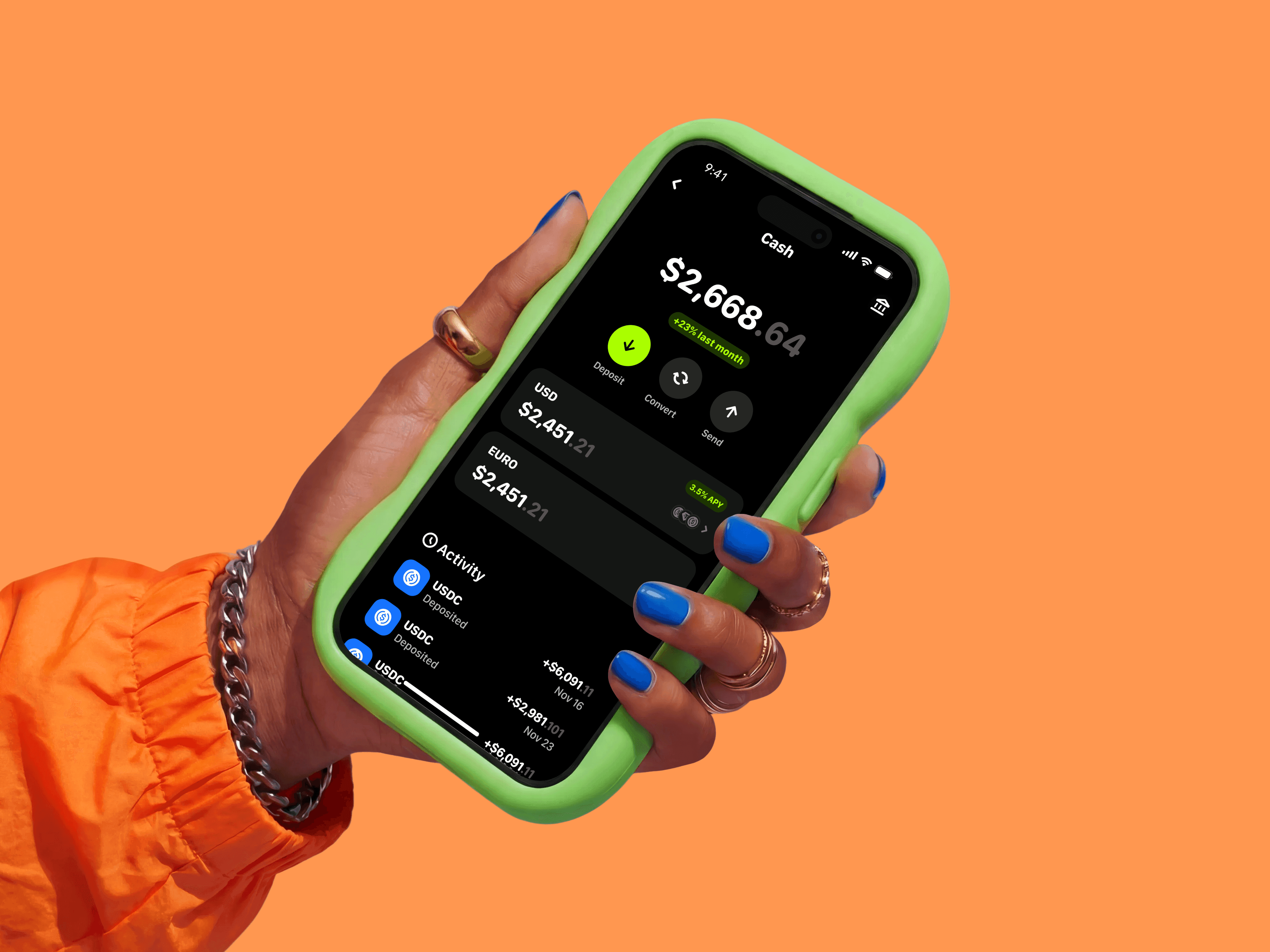 One unified USD balance across all major chains and stablecoins like USDC, USDT, USDS. Convert, spend and send without friction in one tap